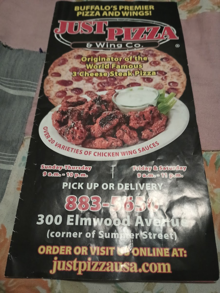 Step into Just Pizza & Wing Co., located at 300 Elmwood Ave, Buffalo, and discover a menu that celebrates the best of pizza and wings. With hearty options like the 3 Cheese Steak Potato Skins and succulent BBQ Chicken Pizza, every dish delivers on flavor. The large pizzas range from Shrimp Scampi to the classic Hollywood, each made with quality ingredients and a perfectly crispy crust. Customers rave about the generous toppings, like on the Large Hawaiian Pizza and the satisfying Medium Chef Salad, which easily serves a crowd. Patrons appreciate the friendly service that makes for a welcoming atmosphere, perfect for dining in or taking out after a day exploring nearby Niagara Falls. Just Pizza & Wing Co. not only quenches your hunger but creates memorable experiences, making it a staple for locals and visitors alike.